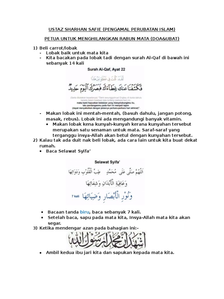 Terasa mahu mencuba beberapa petua merawat rabun mata yang dikongsikan oleh Ustaz Sharhan Safie di satu slot Tanyalah Ustaz di TV 9 beberapa bulan yang lalu. فكشفنا عنك غطاءك فبصرك اليوم حديد. Doa Dipermudahkan Segala Urusan.